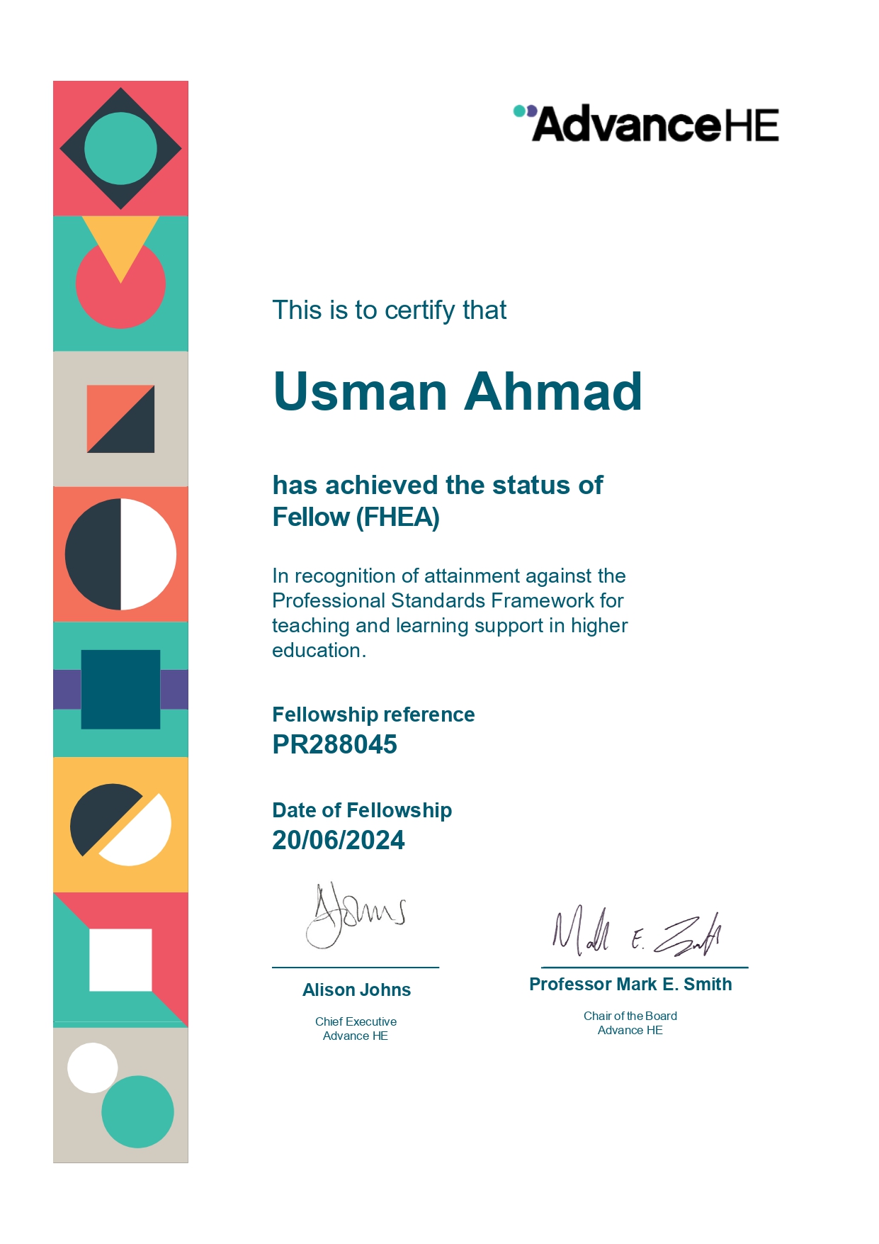 *I am honored to have been awarded the Fellowship of the Higher Education Academy (FHEA). This recognition highlights my dedication to advancing teaching excellence in higher education.
