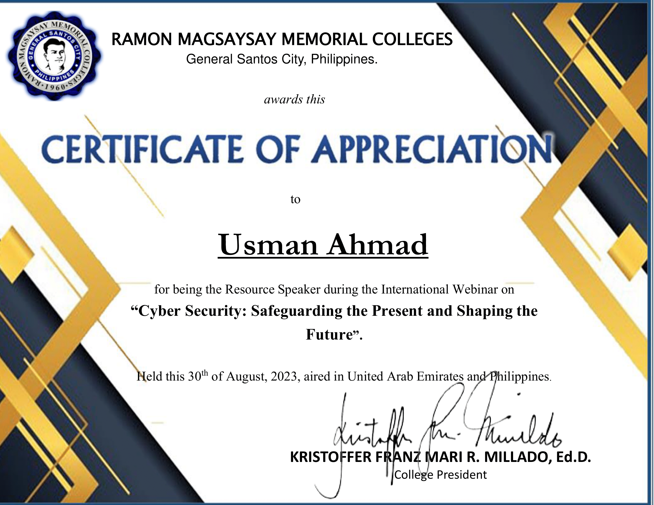 August 30, 2023: I was honored to be a guest lecturer for RMMC College Phillipines and conducted a webinar on Cyber Security: Safeguarding the Present and Shaping the Future ๐๐ผ