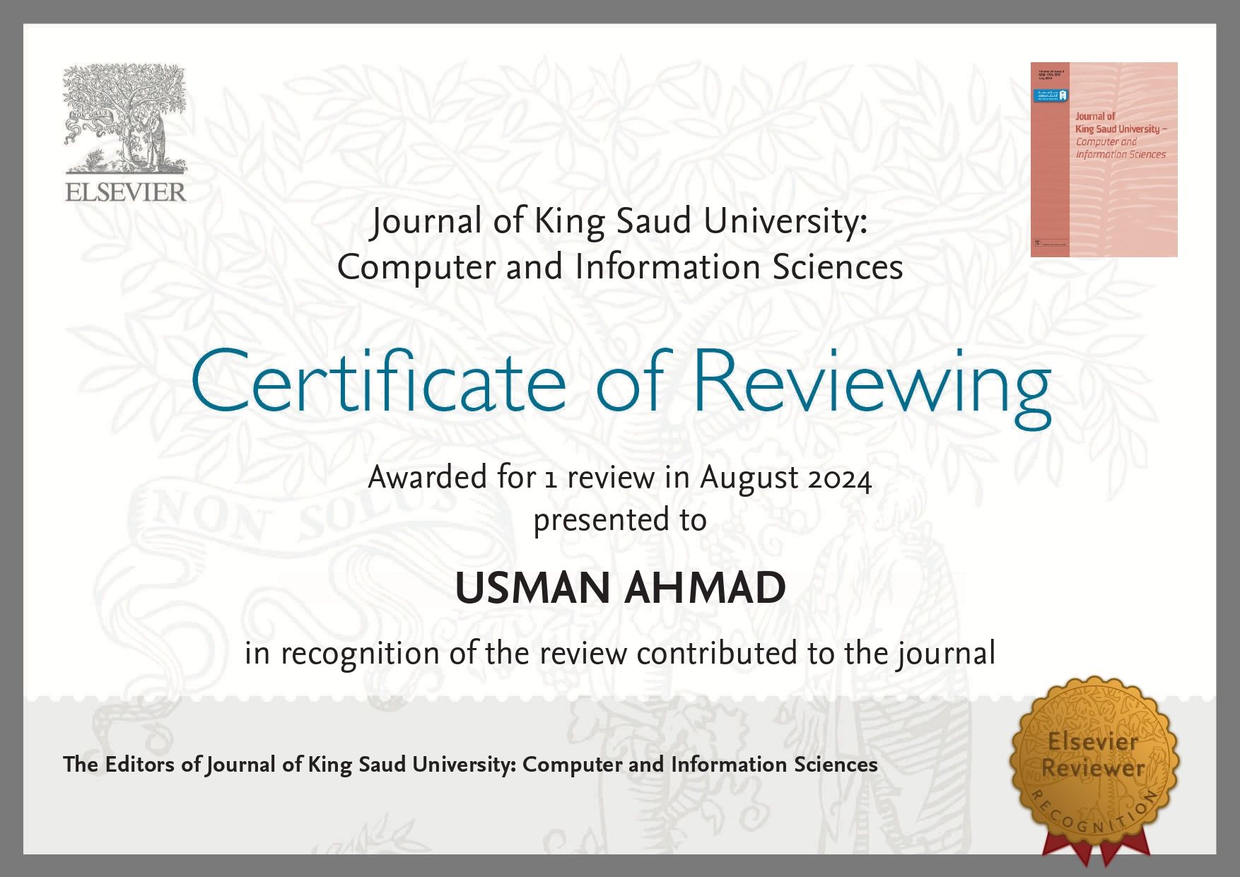 June 12, 2023: I had been invited to be a reviewer at the Journal of King Saud University - Computer and Information Sciences!